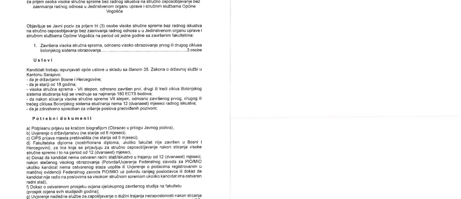 Objavljuje se Javni poziv za prijem tri (3) osobe visoke stručne spreme bez radnog iskustva na stručno osposobljavanje bez zasnivanja radnog odnosa u u Jedinstvenom organu uprave i stručnim službama Općine Vogošća na period od jedne godine sa završenim fakultetima: