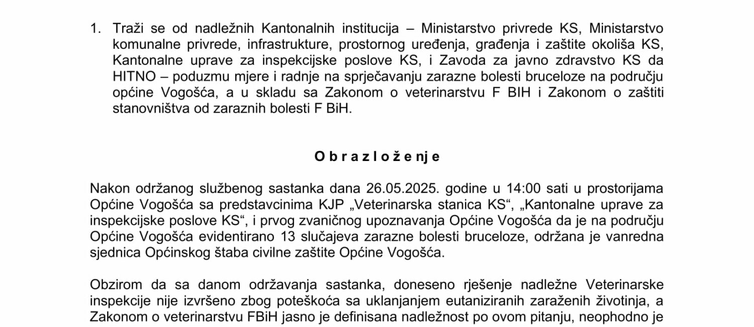 1. Traži se od nadležnih Kantonalnih institucija – Ministarstvo privrede KS, Ministarstvo komunalne privrede, infrastrukture, prostornog uređenja, građenja i zaštite okoliša KS, Kantonalne uprave za inspekcijske poslove KS, i Zavoda za javno zdravstvo KS da HITNO – poduzmu mjere i radnje na sprječavanju zarazne bolesti bruceloze na području općine Vogošća, a u skladu sa Zakonom o veterinarstvu F BIH i Zakonom o zaštiti stanovništva od zaraznih bolesti F BiH.