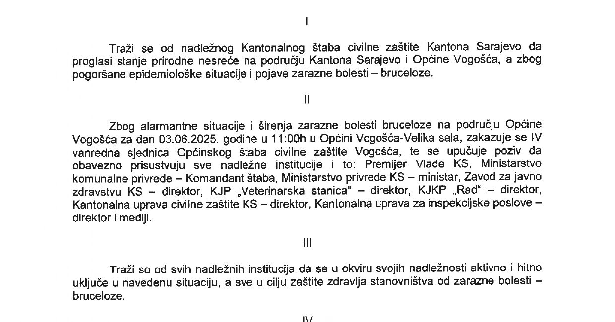 Zbog alarmantne situacije i širenja zarazne bolesti bruceloze na području Općine Vogošća za dan 03.06.2025. godine u 11:00h u Općini Vogošća-Velika sala, zakazuje se IV vanredna sjednica Općinskog štaba civilne zaštite Vogošća, te se upučuje poziv da obavezno prisustvuju sve nadležne institucije i to: Premijer Vlade KS, Ministarstvo komunalne privrede – Komandant štaba, Ministarstvo privrede KS – ministar, Zavod za javno zdravstvu KS – direktor, KJP „Veterinarska stanica“ – direktor, KJKP „Rad“ – direktor, Kantonalna uprava civilne zaštite KS – direktor, Kantonalna uprava za inspekcijske poslove – direktor i mediji.