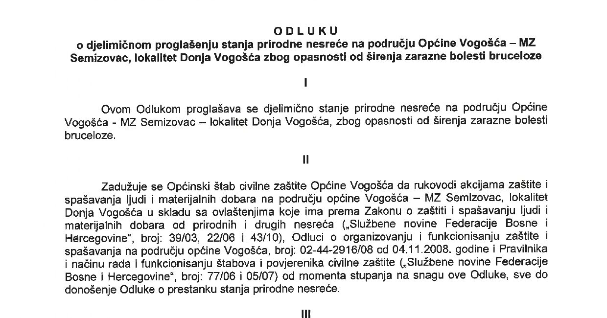 Ovom Odlukom proglašava se djelimično stanje prirodne nesreće na području Općine Vogošća – MZ Semizovac – lokalitet Donja Vogošća, zbog opasnosti od širenja zarazne bolesti bruceloze.