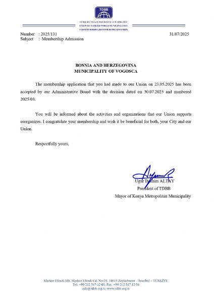 Predsjednik TDBB-a i gradonačelnik metropolitanske općine Konya, gospodin Uğur İbrahim Altay, uputio je čestitku Općini Vogošća povodom prijema u članstvo, uz želje da članstvo bude od obostrane koristi – kako za našu Općinu, tako i za samu Uniju.